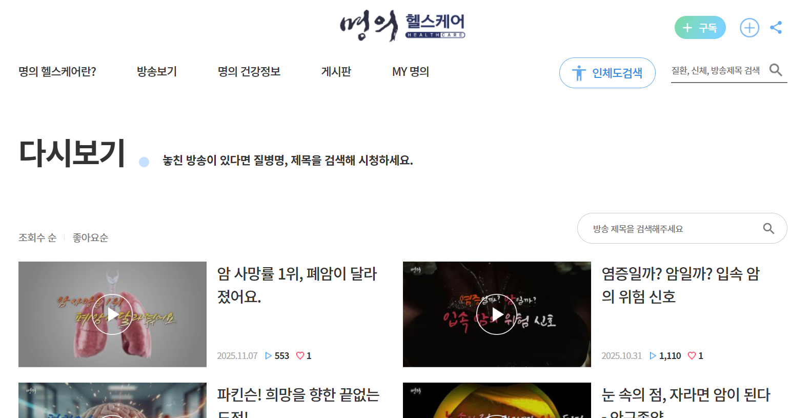 로그인 후 홈페이지 상단에 위치한 검색창에 ‘명의 헬스케어’라고 입력하면 관련 프로그램 페이지로 이동할 수 있습니다. 해당 페이지에는 최근 방송된 회차뿐 아니라 지난 시즌의 다양한 영상도 목록 형태로 정리되어 있어 쉽게 찾아볼 수 있습니다. 또한, 다시보기 탭을 클릭하면 무료로 제공되는 영상 리스트가 상세히 나옵니다.